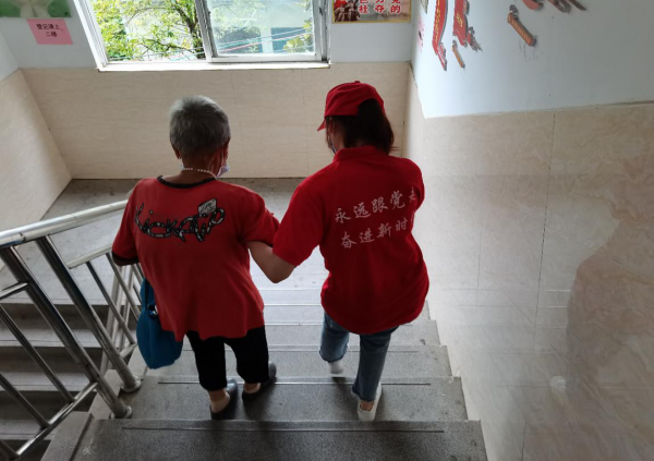 图为助力疫苗接种志愿者扶老奶奶下楼梯中国青年网通讯员钟小恩摄