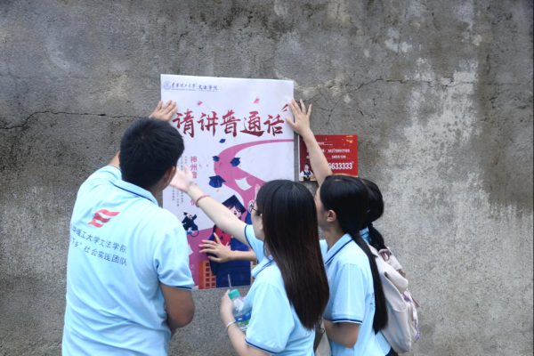 (图为东华理工大学文法学院推普助力乡村振兴社会实践团队在乌石镇张贴自制的海报。韩成宁、薄雅芳供图)