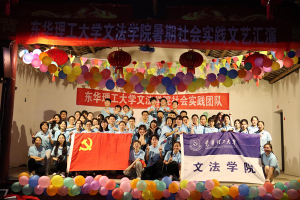 (图为东华理工大学文法学院推普助力乡村振兴社会实践团队在文艺晚会的合影。陈湘钰、鲍福音供图)