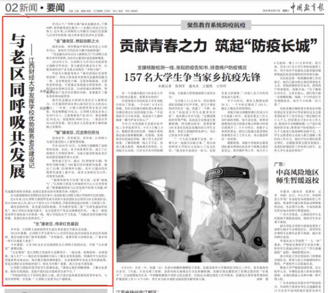 8月11日,中国教育报02版发表《与老区同呼吸共发展——江西财经大学发挥学校优势服务老区建设记》,文章对江西财经大学融合江西本土红色资源与自身学科优势,助力革命老区经济社会发展进行了详细的报道。