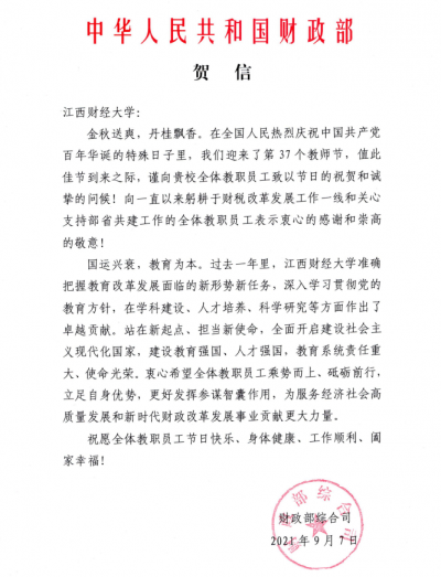 在全国人民热烈庆祝中国共产党百年华诞的特殊日子里,我们迎来了第37个教师节,财政部向江西财经大学发来贺电,向学校全体教职员工致以节日的祝贺和诚挚的问候。祝愿学校全体教职员工节日快乐、身体健康、工作顺利、阖家幸福。
