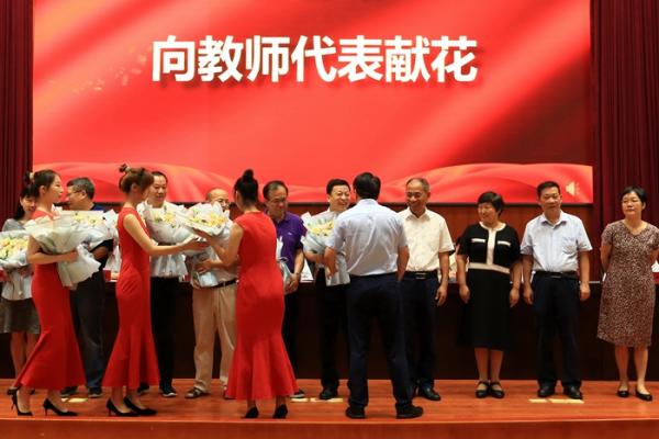 校长邓辉向优秀教师代表献花。