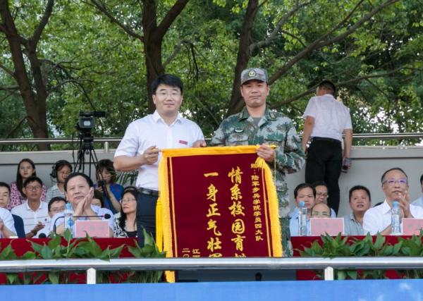 校长邓辉现场为陆军步兵学院赠送锦旗,表达学校对承训单位的衷心感谢。