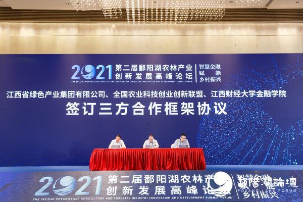 在嘉宾的共同见证下,江西省绿色产业集团、全国农业科技创业创新联盟和江西财经大学金融学院共同签署了战略合作框架协议。
