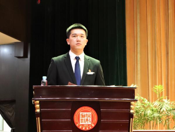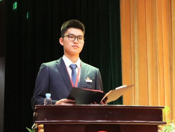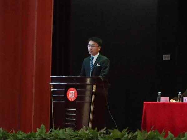 经济学院2019级叶林弘同学向大会宣读主题为“牢记宗旨,强化引领,深化改革,服务大局,用实在业绩和清新形象赢得同学真心‘点赞’”的倡议书。