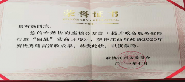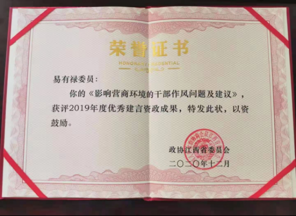 此前,易有禄提交的《影响营商环境的干部作风问题及建议》被政协江西省政协评为2019年度优秀建言资政成果。