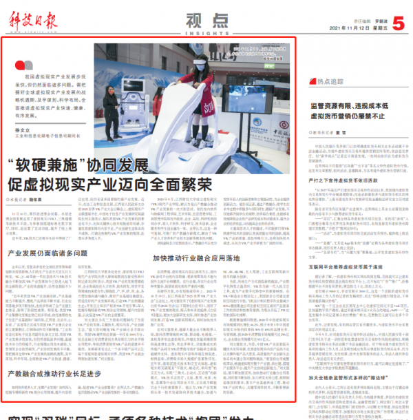 11月12日,科技日报5版头条发表《“软硬兼施”协同发展促虚拟现实产业迈向全面繁荣》,文章对江西财经大学成立虚拟现实(VR)现代产业学院,产教融合推动VR产业创新发展进行了详细报道。