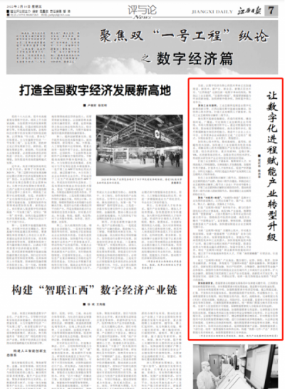 2月18日,《江西日报》07版“评与论”版块刊登江西财经大学副校长袁红林理论文章《让数字化进程赋能产业转型升级》。