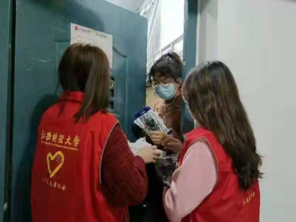(江西财经大学国贸学院团委“敲门行动”为同学发放防疫物资)