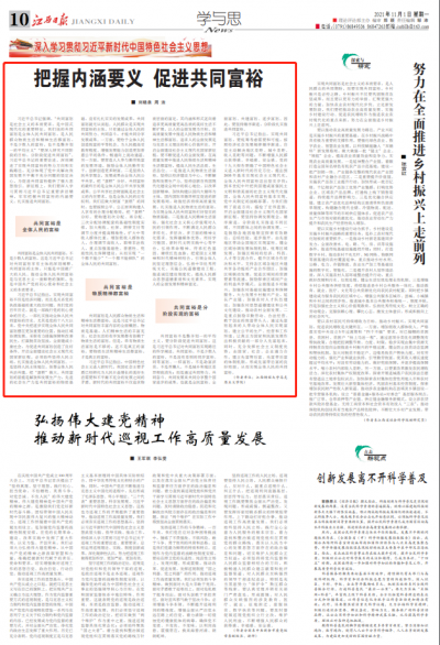 11月1日,《江西日报》第10版“学与思”版块刊登马克思主义学院党委书记刘晓泉理论文章《把握内涵要义促进共同富裕》。