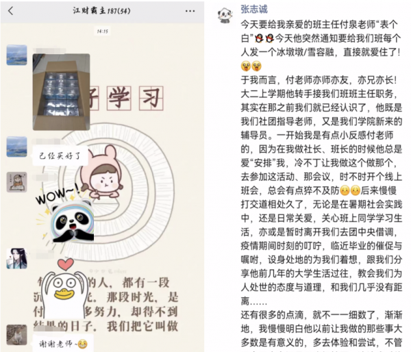 公管187班的张志诚同学还在朋友圈晒出了“感谢信”,他这样写道:“班主任与我们亦师亦友、亦兄亦长,疫情期间时刻的叮咛、临近毕业的催促与嘱咐都是日常生活中对我们的关心,他总能设身处地的为我们着想,教会我们为人处世的态度与道理。”