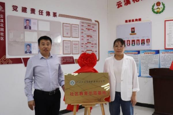 仪式上,韩莹汇报了基地的建设情况。丁秋云对学院与云溪花园社区一直保持紧密合作,在交通安全、茶艺表演、党史知识学习等方面开展的指导帮助表示感谢。丁秋云表示,此次社区教育示范基地落到云溪花园社区,既为社区居民提供了提升科学文化素质、思想道德素质、技能技术水平的教育平台,又为积极探索校地合作、乡村振兴等工作打开了局面,她希望经过双方的实践与探索,云溪花园的社区教育工作水平得到更好的提升。