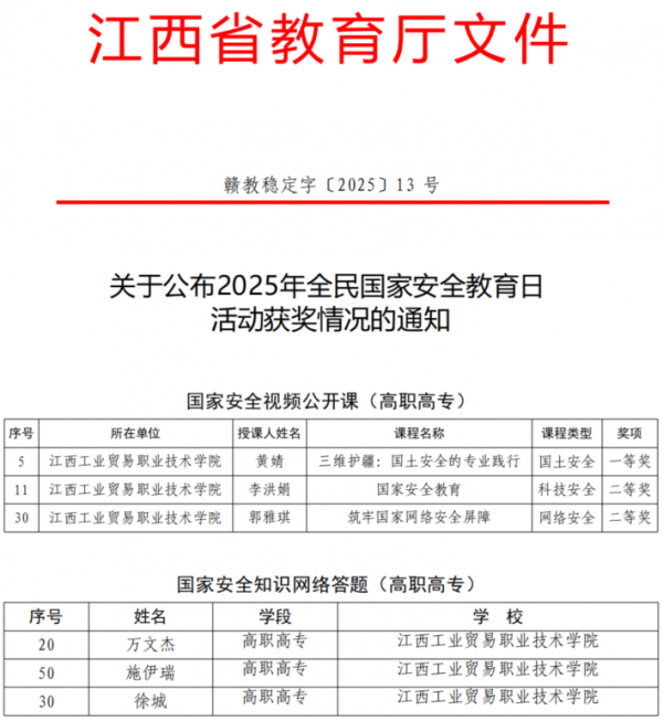 近日,江西省教育厅印发《关于公布2025年全民国家安全教育日活动获奖情况的通知》(赣教稳定字〔2025〕13号),江西工业贸易职业技术学院师生在活动中喜获佳绩。在国家安全视频公开课(高职高专)活动中,黄婧老师的《三维护疆:国土安全的专业践行》荣获一等奖,李洪娟老师的《国家安全教育》和郭雅琪老师的《筑牢国家网络安全屏障》荣获二等奖;国家安全知识网络答题活动中,万文杰、徐城、施伊瑞三位同学荣获“学习之星”称号。
