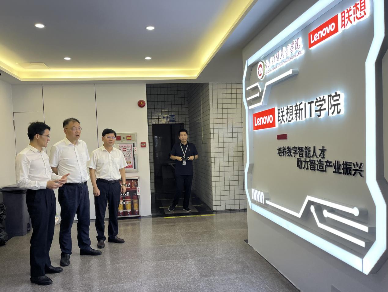 在广东财贸职业学院,晏斌一行受到了该校党委书记罗贤甲、副校长吴洲的热烈欢迎,并参观了联想新IT产业学院。随后双方开展了座谈交流,晏斌介绍了学院基本情况以及“双高”建设、升本等重点工作的做法和成效,罗贤甲和吴洲围绕该校打造的“两高地两典范”进行了详细介绍。双方在人事管理、国际交流、产教融合、校区建设等方面工作进行了交流互鉴。