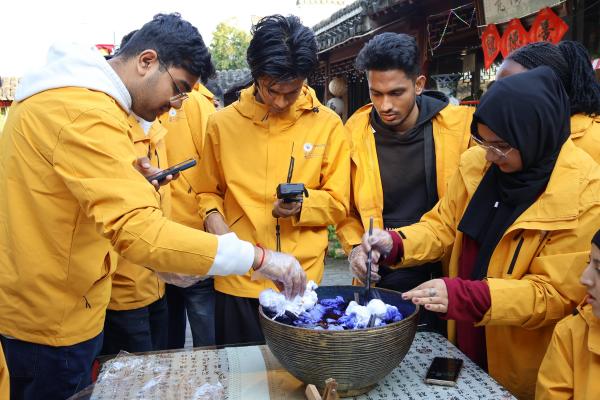 “一折、二绕、三扎紧,染料要慢慢浸,这样花纹才会更灵动。”在扎染体验课堂上,英国伦敦里士满大学学生Aryan专注地跟着步骤操作,手中的白布在他的巧手下逐渐染上蓝白相间的花纹。“这是我第一次亲手做传统手工艺,每一个步骤都充满惊喜,这种‘独一无二’的创作太神奇了!”Aryan举起自己的扎染作品,兴奋地与身边的中国伙伴分享。