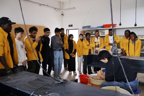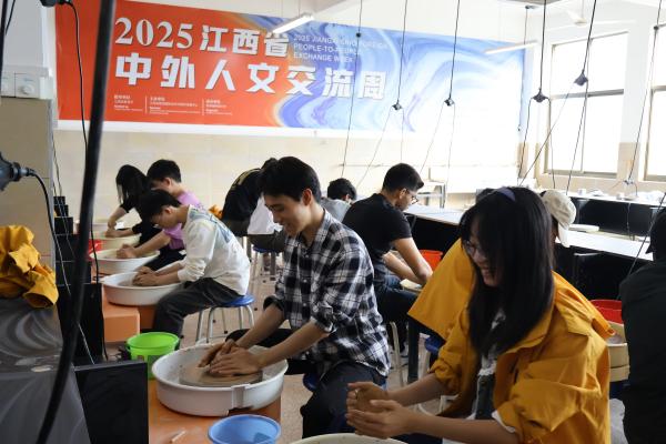 “落霞与孤鹜齐飞,秋水共长天一色——原来诗里的景色真的存在!”站在滕王阁,RosePaula望着赣江波光粼粼的江面,一边聆听《滕王阁序》的典故,一边用手机拍下湖光秋色的画面。走进景德镇陶瓷大学,美术学院副教授、景德镇市古彩非遗传承人刘芳早已备好陶土与工具,她笑迎师生:“今天咱们不只是‘看陶瓷’,还要一起‘懂陶瓷’。”说着,刘芳转动拉坯机,一边演示,一边耐心解答师生的疑问,从“什么样的泥土适合做陶瓷”到“古彩颜料如何调配才能经久不褪色”,每一个知识点都讲解得生动细致。期间,师生也亲身体验了“泥土的魔力”,感悟陶瓷文化的深厚底蕴。