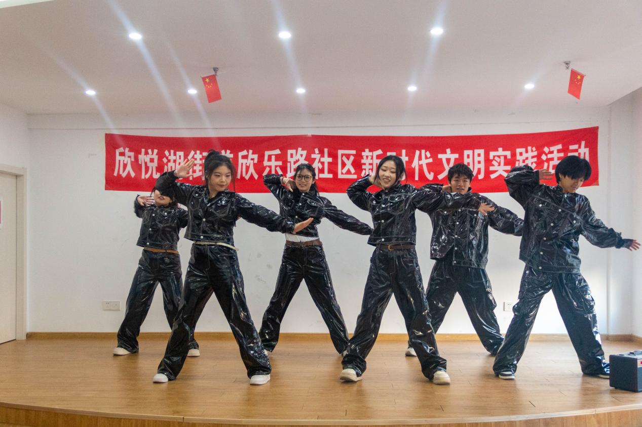 文艺汇演环节在社区新时代文明实践中心精彩上演。街舞《奔跑吧青春》以活力四射的舞姿展现青年学子的蓬勃朝气;歌曲联唱《上春山》《致光阴》旋律悠扬,引发在场中老年居民的共鸣,不少人跟着节奏轻声哼唱;歌伴舞《党旗飘扬的方向》以激昂的旋律和深情的演绎,将现场气氛推向高潮,进一步弘扬了爱国主义精神,增强了社区凝聚力。居民杨爱花看完演出后说:“大学生们的表演很接地气,看着心里暖洋洋的。”参与汇演的团委学生徐邦超感慨道:“当看到台下爷爷奶奶跟着节奏拍手时,我突然明白文艺不仅是表演,更是连接情感的桥梁,这种双向的温暖太珍贵了。”