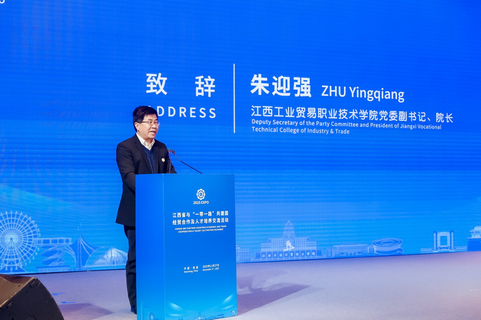 作为江西-非洲职业教育联盟成员单位代表,朱迎强在活动现场致辞。他重点围绕学院概况、国际合作与交流工作成效及联盟未来发展方向展开阐述,并表示学院将从三方面助力联盟建设:一是共享优质教育资源,共育急需技能人才;二是深化产教融合协同,助推企业“走出去”;三是搭建多元交流平台,促进文明互鉴共赢,为推动“一带一路”经贸合作与中非友好关系发展作出新的更大贡献。