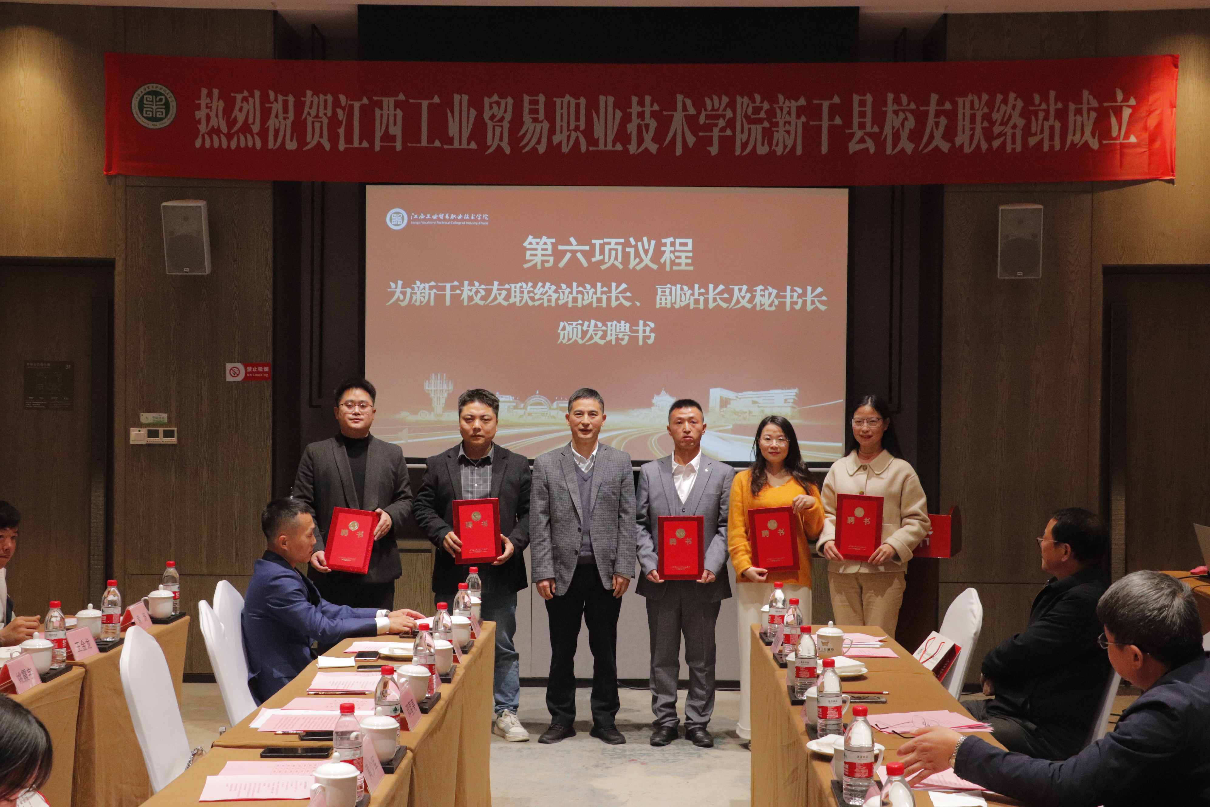 成立大会在庄严的国歌声中拉开序幕。与会人员共同观看了江西工业贸易职业技术学院宣传片,直观感受母校发展变迁。傅艳华宣读《关于成立江西工贸学院新干校友联络站的决定》,会议审议并表决通过《江西工贸学院新干校友联络站章程》及站长、副站长、秘书长、副秘书长人选名单。随后,吴新谱与邓星亮共同为新干校友联络站揭牌,吴新谱还为联络站首任站长邓星亮,副站长黄少军、杨珍群,秘书长凌杰及副秘书长胡仲凡颁发聘书。