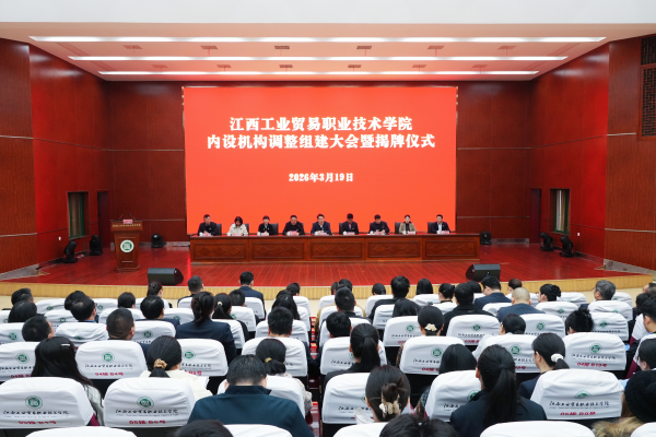 为深入贯彻落实党的教育方针,主动适应职业教育高质量发展新要求,深化学校综合改革、完善治理体系、提升办学效能,2026年3月19日上午,江西工业贸易职业技术学院在学术报告厅隆重举行内设机构调整组建大会暨揭牌仪式。全体校领导、全体中层干部、全体行政人员及教职工代表参加会议,会议由学校党委委员、纪委书记何锐主持。