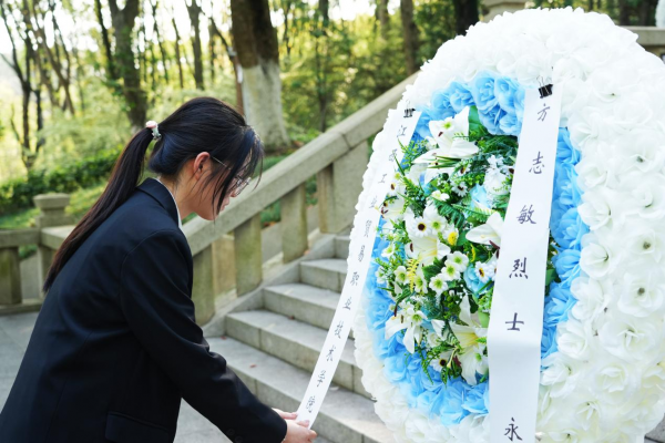 随后,师生代表缓步向前,向革命烈士敬献花圈。全体人员肃立静穆、行三鞠躬礼,并集体默哀一分钟,向为民族独立、人民解放英勇献身的革命先烈致以最崇高的敬意。仪式结束后,师生们缓步瞻仰烈士墓,认真聆听革命事迹,追思先烈们浴血奋战、不怕牺牲的英雄壮举,接受深刻的红色精神洗礼。